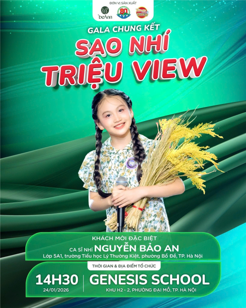 Ngày 24/1/2026, em Nguyễn Bảo An – Liên đội trưởng, học sinh lớp 5A1, Trường Tiểu học Lý Thường Kiệt sẽ cùng các học sinh tiêu biểu của lớp tham gia biểu diễn và vinh danh tại Gala “Sao Nhí Triệu View” lần thứ I – năm 2026, do Báo Thiếu niên Tiền phong và Nhi đồng (cơ quan báo chí của Trung ương Đoàn TNCS Hồ Chí Minh) tổ chức.