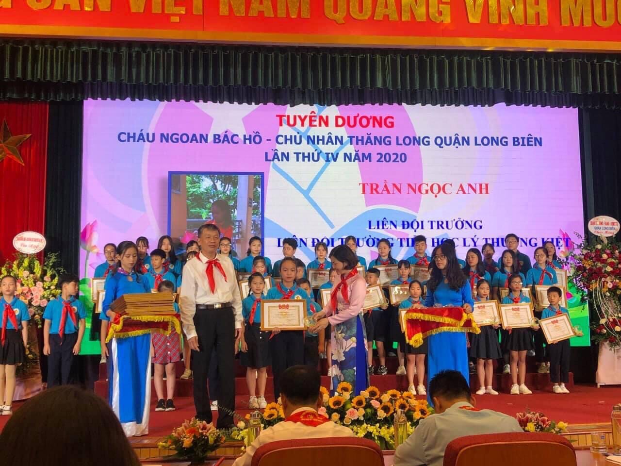 Tập thể học sinh lớp 5A do cô giáo Lưu Kim Oanh chủ nhiệm thật tự hào vì có một chi đội trưởng gương mẫu, giỏi giang. Đó là Trần Ngọc Anh , một bạn gái xinh xắn, năng động và đầy tinh thần trách nhiệm. Gặp Ngọc Anh, ai cũng cảm thấy cô bé này thật dễ mến, khuôn mặt bầu bĩnh, đôi mắt đen láy lúc nào cũng lấp lánh như muốn cười. Ngọc Anh hiền lành , chan hòa với các bạn nên không chỉ riêng trong lớp 5A mà các bạn học sinh cả trường cũng rất yêu quí và nể phục cô bạn này. Giờ học nào, Ngọc Anh cũng hăng hái giơ tay phát biểu, xây dựng bài và sẵn sàng trao đổi chia sẻ kiến thức với các bạn. Đặc biệt không những học giỏi mà Ngọc Anh nhảy rất đẹp, bạn tham gia học thêm bộ môn này từ nhỏ và sẵn sàng tham gia biểu diễn trên sân khấu trong các kì cuộc phong trào nhà trường. Nhờ sự nỗ lực của bản thân, sự quan tâm, động viên của bố mẹ cũng như sự dạy dỗ kèm cặp của các thầy cô giáo mà năm học nào Ngọc Anh cũng đạt danh hiệu học sinh xuất sắc. Em còn là thành viên tích cực trong cuộc thi “Thiếu niên Thủ đô với phòng dịch Covid” trong tháng 4 năm 2020 vừa qua. Bốn năm học trôi thật nhanh. Đặc biệt, năm nay chi đội trưởng Trần Ngọc Anh đã xứng đáng được nhận bằng khen Liên đội trưởng xuất sắc trong công tác Đội và phong trào thiếu nhi do BCH Đoàn TNCS Hồ Chí Minh quận Long Biên trao tặng trong lễ tuyên dương Cháu ngoan Bác Hồ - Chủ nhân Thăng Long Quận Long Biên lần thứ IV năm 2020.