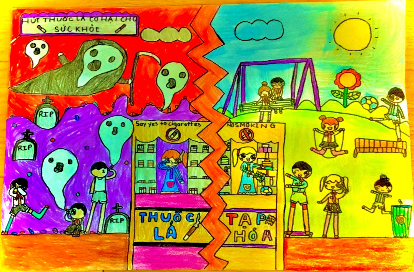 Thế giới không khói thuốc – smoke – free world” dành cho thiếu nhi toàn liên đội với mục đích tuyên truyền về nhận thức, hành vi và ý thức trách nhiệm của thiếu nhi trong việc nâng cao sức khỏe thế hệ thanh thiếu niên, nhi đồng Việt Nam; nhằm tạo sân chơi bổ ích và lý thú giúp các em học sinh trau dồi kiến thức về phòng, chống tác hại của thuốc lá. Từ đó các em học sinh có thể tuyên truyền giúp mọi người hiểu hơn về tác hại của thuốc lá qua những tác phẩm tranh đầy sáng tạo, ngôn ngữ của màu sắc, đường nét của các bạn nhỏ vô cùng phong phú đã thể hiện khao khát, ước mơ về một thế giới không khói thuốc của các em. Mượn lời phát biểu của cô hiệu trưởng Nguyễn Thúy Hà: “