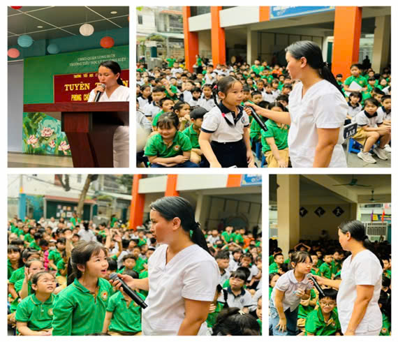 Học sinh hăng hái phát biểu trong buổi tuyên truyền của cô y tế