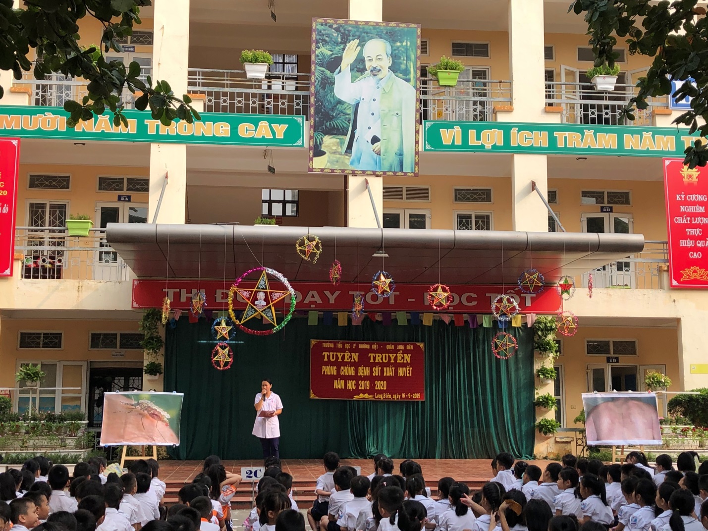 Sáng ngày 16/9/2019 được sự đồng ý của Ban giám hiệu nhà trường, Liên đội Tiểu học Lý Thường Kiệt tổ chức Tuyên truyền phòng chống bệnh sốt xuất huyết cho toàn thể cán bộ giáo viên, nhân viên và hơn 690 học sinh toàn Liên đội, qua buổi tuyên truyền các em học sinh biết được biểu hiện của bệnh, mức độ nguy hại cũng như cách phòng tránh. Hãy cùng cô Nguyễn Thị Thảo cán bộ ý tế của nhà trường tìm hiểu về bệnh sốt xuất huyết.