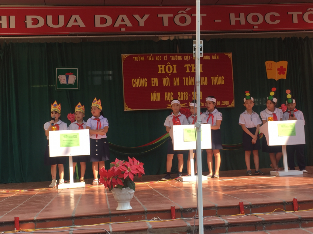 Thực hiện Công văn số 4295/UBND- ĐT ngày 17 tháng 9 năm 2018 của UBND Thành phố Hà Nội về việc triển khai tháng cao điểm An toàn giao thông cho học sinh đến trường năm học 2018-2019. Nhằm giáo dục cho các em học sinh nắm được Luật giao thông đường bộ đặc biệt là việc chấp hành việc đội mũ bảo hiểm khi ngồi sau xe máy, xe đạp điện tới trường đồng thời tạo ra một sân chơi bổ ích cho các em học sinh. Sáng ngày 1 tháng 10 năm 2018 Liên đội Tiểu học Lý Thường Kiệt tổ chức Hội thi “Chúng em với an toàn giao thông”, đến dự và động viên nhà trường có Đ/c Vũ Thị Thanh - Cán bộ Quận Đoàn, Ông Nguyễn Toàn Thắng – Trưởng ban đại diện CMHS nhà trường. Hội thi đã thành công tốt đẹp và nhận được những lời khen từ phía cán bộ Quận đoàn, sự tin tưởng của cha mẹ học sinh.