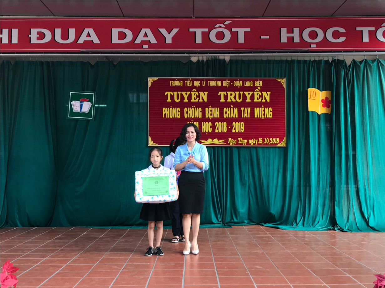 Cô giáo Đào Thị Huệ - Phó hiệu trưởng nhà trường trao cờ và quà cho chi đội 5B và lớp nhi đồng 2A.