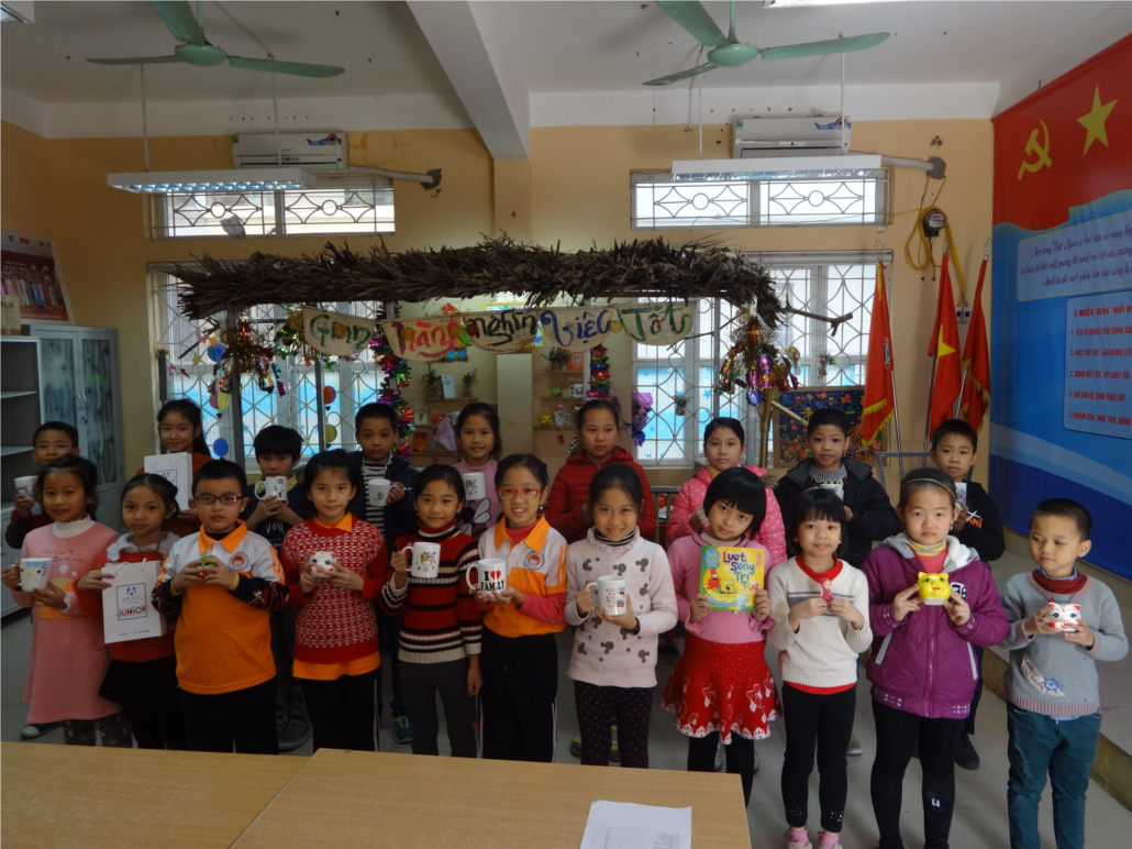 Một tháng hai lần sau buổi sinh hoạt dưới cờ vào các tuần chẵn, Liên đội sẽ trao tặng 25-30 phiếu nhận quà tại Gian hàng nghìn việc tốt, những em Đội viên nhi đồng có phiếu nhận quà sẽ được lựa chọn một (01) món quà mà mình yêu thích: Những chiếc cốc có nhiều hình ngộ nghĩnh, những chú lợn tiết kiệm, những con vật đáng yêu dùng để đồ dùng học tập, những quyển sách hay, tập thơ hay, những chiếc bút màu, những sản phẩm handmade như thiếp, đèn lồng...).
