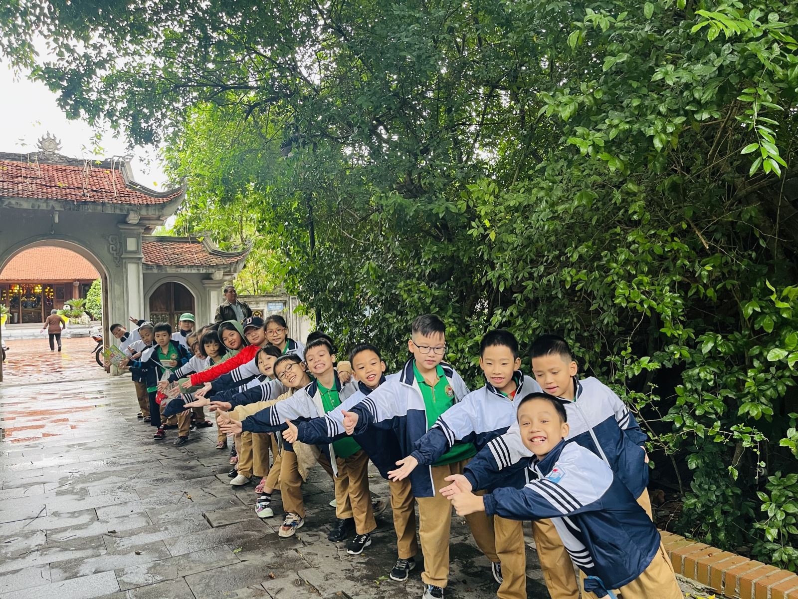 Kết thúc điểm tham quan thứ nhất, các lớp đã chụp lại những bức ảnh lưu niệm dưới cổng đình.