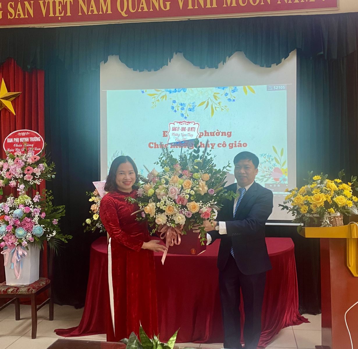 Ông Bùi Việt Hùng trưởng ban CMHS tặng hoa và chúc mừng các thầy cô giáo