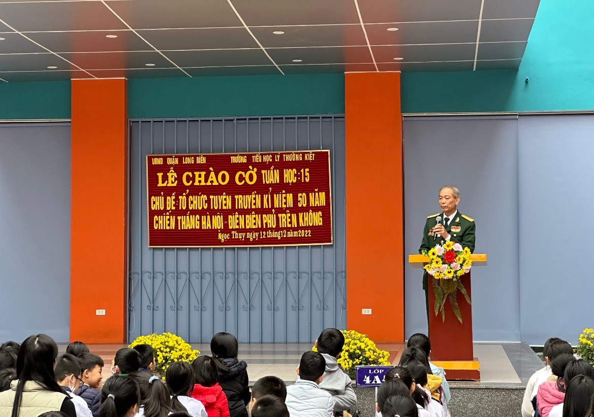 Cao Tiến Thăng – Đại tá – Giảng viên Học viện học cần – đã chia sẻ với các em học sinh trường Tiểu học Lý Thường Kiệt về những khó khăn, vất vả của bộ đội ta thời xưa. Đồng thời, bác cũng chia sẻ về sức mạnh quân sự của quân đội Mỹ lúc bấy giờ tham gia đánh chiếm miền Bắc nước ta. Nhưng nhờ sự chỉ đạo đúng đắn, tài tình, sáng tạo của Trung ương Đảng và chủ tịch Hồ Chí Minh đã phát huy được sức mạnh tổng hợp của các lực lượng và Nhân dân làm nên chiến thắng lịch sử.