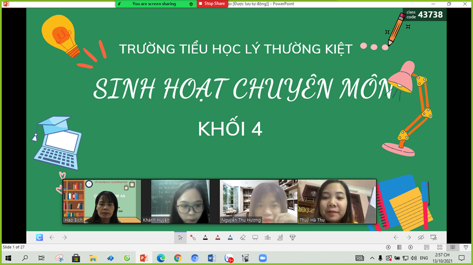 Sinh hoạt chuyên môn là một hoạt động quan trọng giúp cho công tác dạy và học đạt chất lượng tốt, đặc biệt trong bối cảnh dạy học cần đáp ứng với các yêu cầu trong tình hình mới. Tại mỗi buổi sinh hoạt chuyên môn, giáo viên khối 4 trường Tiểu học Lý Thường Kiệt đã cùng nhau chia sẻ nhiều nội dung như soạn giáo án điện tử, xây dựng những hình thức học tập thông qua các trò chơi, những slide powerpoint đẹp mắt, các trò chơi trực tuyến học tập qua các phần mềm dạy học mới như Blooket, Quizzi làm cho những giờ học trở nên rất sinh động, cuốn hút học sinh. Nội dung bài giảng của các môn học được truyền tải tới học sinh qua nhiều hình thức đa dạng, phù hợp với từng môn học như: quay video clip hướng dẫn, sử dụng bài giảng điện tử kết hợp tương tác với học sinh qua phần mềm Zoom Cloud Meeting, Google meet…Đặc biệt trong buổi sinh hoạt các đồng chí giáo viên trẻ đã hướng dẫn, chia sẻ các phần mềm ứng dụng CNTT ứng dụng vào dạy học đem lại hiệu quả học tập cho học sinh trong thời gian học tập trực tuyến.