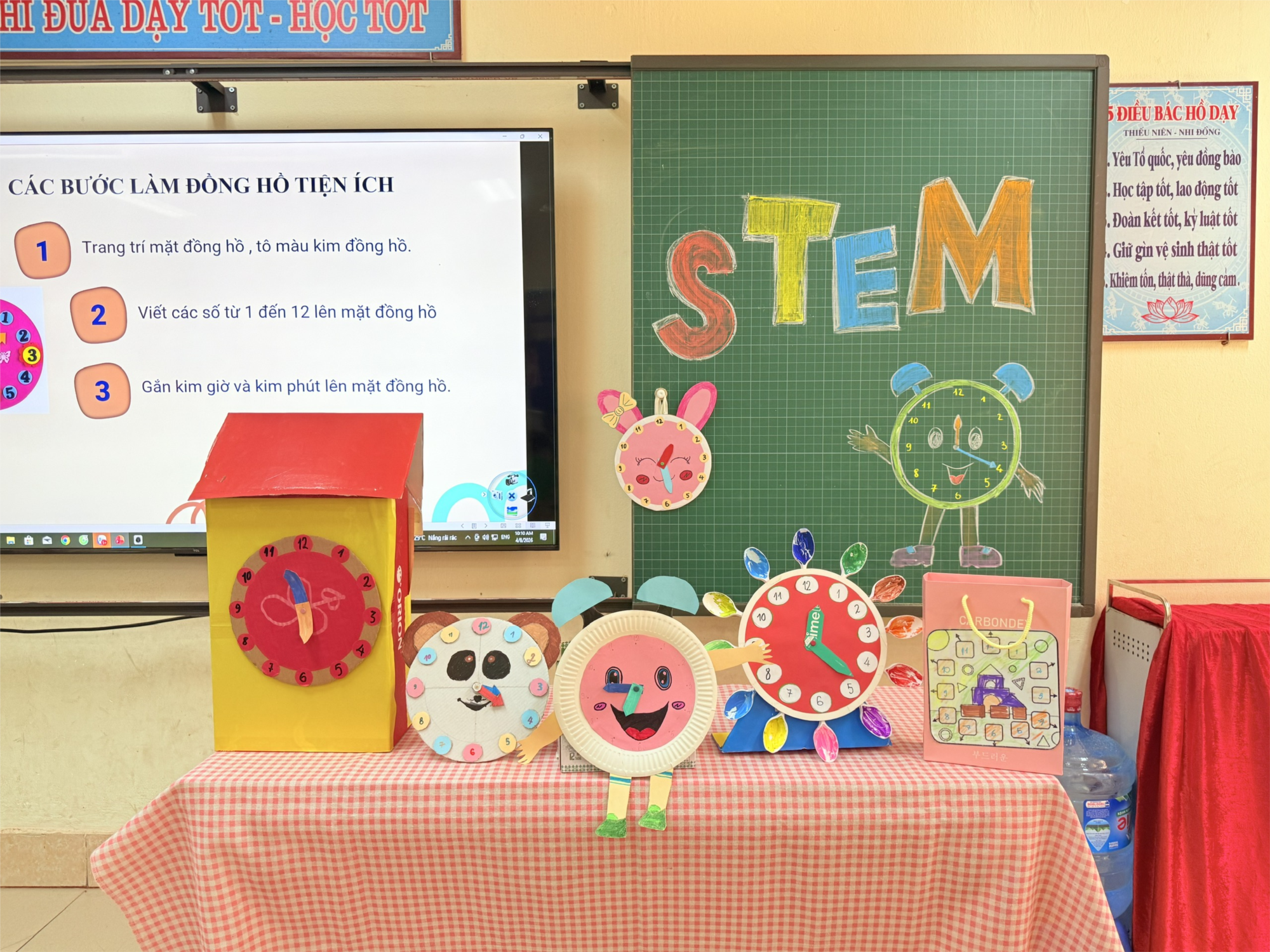 Thông qua hoạt động này, học sinh không chỉ nắm vững kiến thức về thời gian trong môn Toán mà còn được rèn luyện nhiều kỹ năng quan trọng như: làm việc nhóm, tư duy logic, khả năng sáng tạo, kỹ năng thực hành và thuyết trình. Các em được tự tay làm ra sản phẩm của mình, được chia sẻ ý tưởng với bạn bè và tự tin giới thiệu “tác phẩm” trước lớp. Đây chính là những yếu tố cốt lõi mà giáo dục STEM hướng tới.