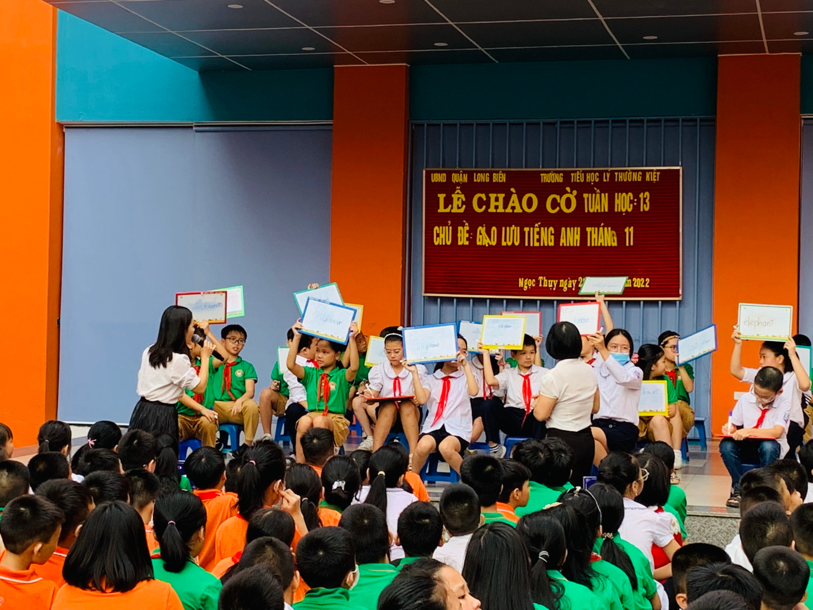 Sáng nay, 28/11/2022, trường tiểu học Lý Thường Kiệt đã tổ chức lễ chào cờ với chủ đề "Giao lưu tiếng Anh tháng 11". Như thường lệ, mở đầu là báo cáo điểm tổng kết, nhận xét về các hoạt động tuần 13 vừa qua và phổ biến phương hướng hoạt động tuần 14. Tiếp theo là phần giao lưu Tiếng Anh dành cho học sinh khối lớp 5.