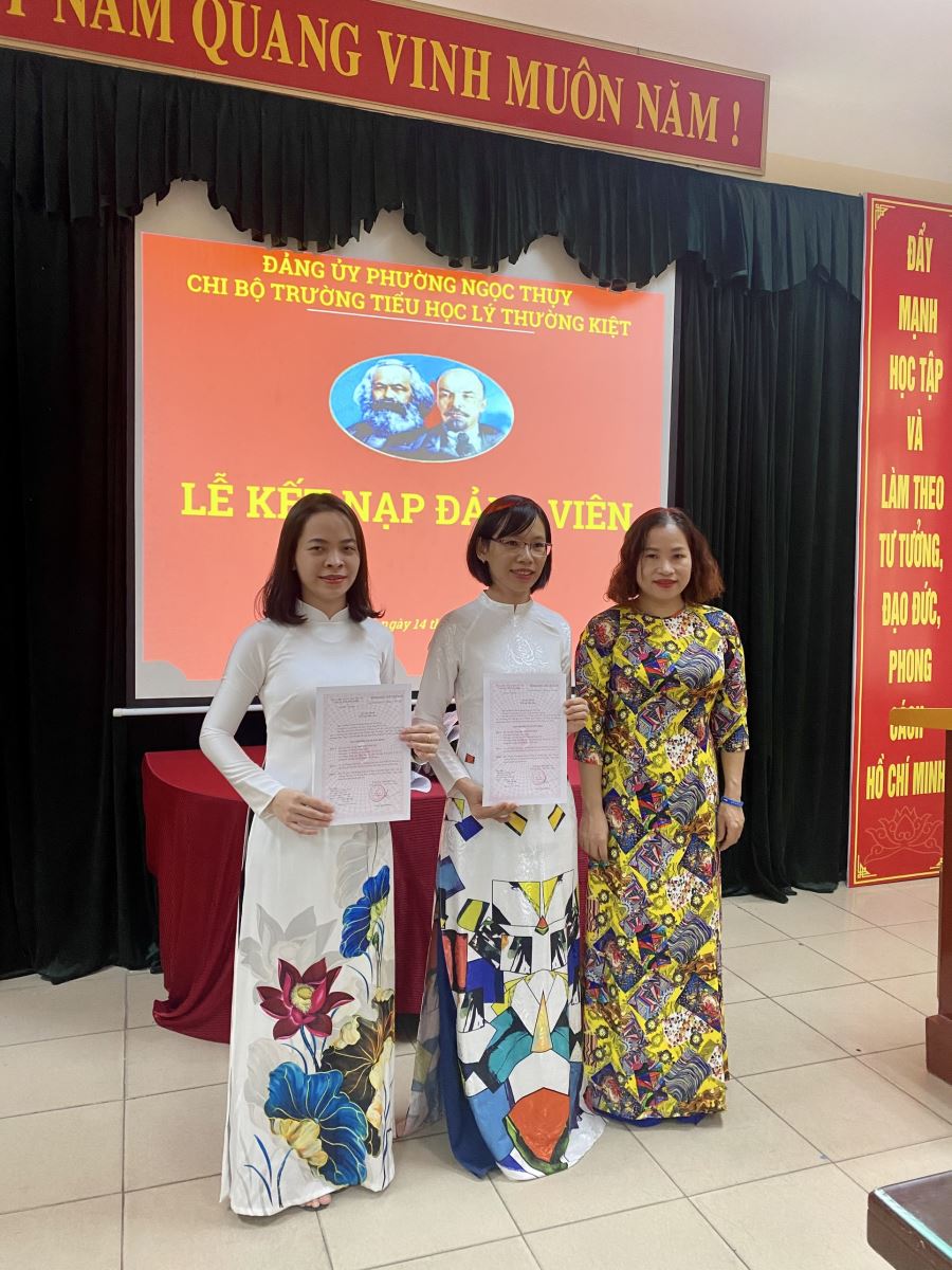 Đồng chí Nguyễn Thúy Hà - Bí thư Chi bộ trao Quyết định kết nạp đồng thời quán triệt nhiệm vụ, quyền hạn của người đảng viên, nhiệm vụ của Chi bộ. Nhận quyết định từ Bí thư Chi bộ, 2 đồng chí Đảng viên mới đứng trước lá cờ Tổ Quốc, cờ Đảng và chân dung Chủ tịch Hồ Chí Minh vĩ đại đọc lời tuyên thệ và hứa sẽ tiếp tục phấn đấu để luôn xứng đáng là người đảng viên gương mẫu, đóng góp sức mình thực hiện thành công nhiệm vụ chính trị của Chi bộ, góp phần xây dựng Chi bộ trường tiểu học Lý Thường Kiệt ngày càng vững mạnh.