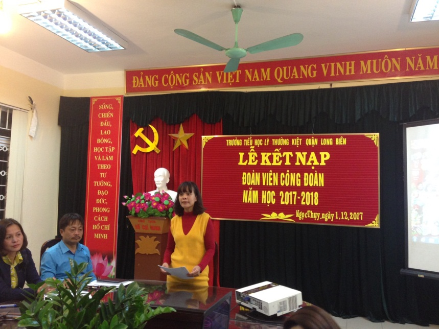 Đồng chí Phạm Hà Thu – chủ tịch công đoàn công bố và trao quyết định cho 8 đồng chí đoàn viên công đoàn mới. Đồng chí Nguyễn Văn Kỳ - Bí thư chi bộ - Hiệu trưởng nhà trường chúc mừng các đoàn viên công đoàn mới được kết nạp và mong muốn trên từng cương vị công tác, các đoàn viên công đoàn mới với sức trẻ, với sự nhiệt huyết của mình không ngừng phấn đấu, chung sức, chung lòng đóng góp công sức để xây dựng dông đoàn, xây dựng Nhà trường ngày càng phát triển.